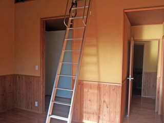 | フロアよりロフトベッドを望む | ロフトベッドへ登る特注の梯子 |